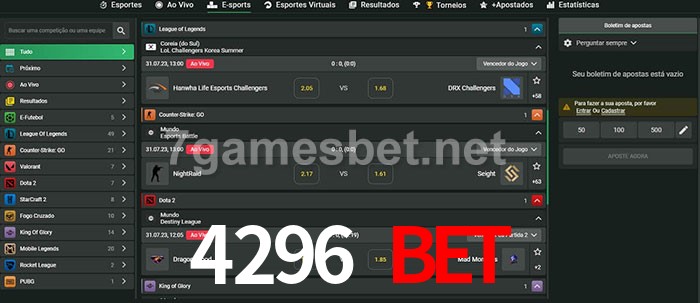 O 4296 Bet oferece uma grande seleção de opções de apostas em e-sports com probabilidades competitivas